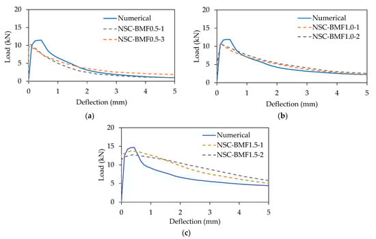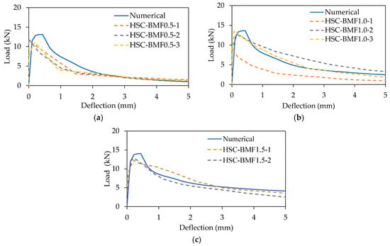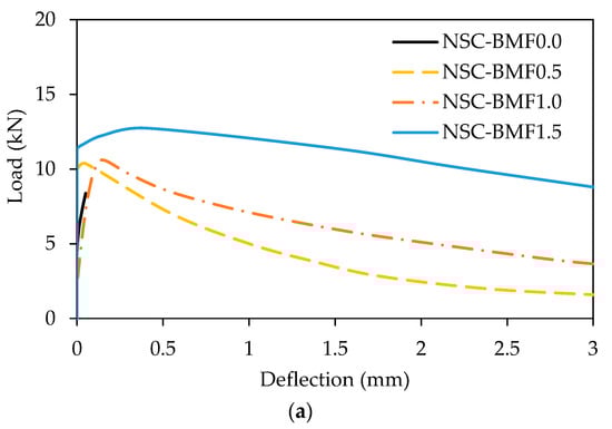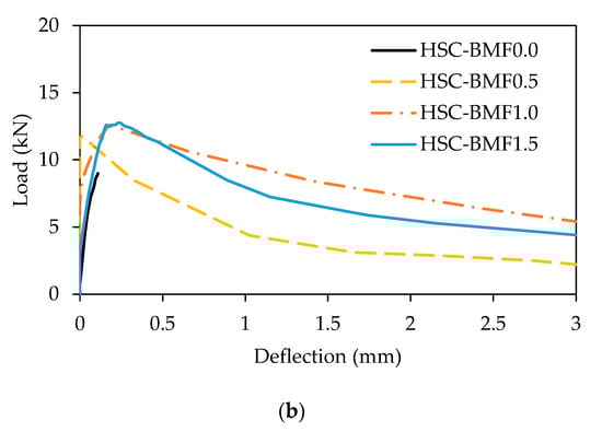 - The increase in the flexural toughness due to increasing the BMF volume fraction from 0.5 to 1% was almost the same (approx. 39%) for the NSC and HSC mixtures. The NSC mixtures exhibited, however, a more pronounced improvement in the flexural toughness (136%) than that of the HSC (73%), when the BMF volume fraction increased from 0.5 to 1.5%.