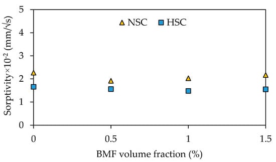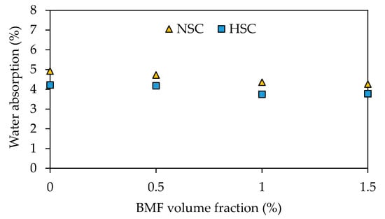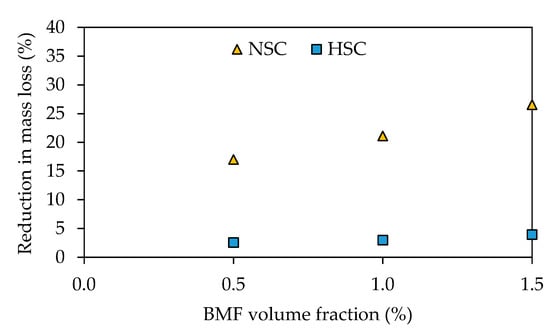 - The NSC and HSC benchmark specimens exhibited abrasion mass losses of 14.2 and 8.3%, respectively. The addition of BMF to the NSC mixtures reduced the mass loss caused by abrasion by up to 27%. The HSC with BMF exhibited a minor reduction in the abrasion mass loss of up to 4% only.