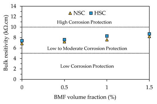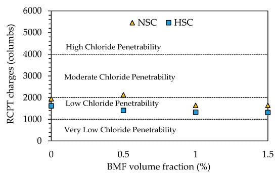 - The NSC and HSC with BMF exhibited a comparable reduction in the water absorption of up 12% relative to that of their plain counterparts. The addition of BMF did not change the level of corrosion protection nor the chloride penetrability category of both NSC and HSC mixtures, despite the slight improvement in the bulk resistivity (max. increase of 21%) and the slightly reduced RCPT electrical charges passed through the concrete (max. reduction of 19%). Similarly, the addition of BMF had almost no effect on UPV values of both NSC and HSC.