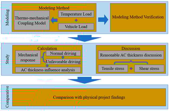 To study the mechanical behavior of a CRC + AC pavement layer, a thermal–mechanical coupling CRC + AC pavement model was established. The pavement structure and basic material mechanical parameters under different temperatures [,] are shown in Table 1. F16 mm ribbed rebar was used for the longitudinal steel of the CRC layer, and F12 mm ribbed rebar was used for the transversal steel. The longitudinal and transversal reinforcement ratios were 0.6% and 0.1%, respectively. The modulus of the ribbed rebar was 2.0 × 105 MPa, and the density was 7800 kg·m−3. Both the longitudinal and transversal steel were set in the intermediate position of the CRC layer and embedded into the layer in the form of continuous steel mesh using the embedded region constraint type in ABAQUS. There were transverse cracks set in the CRC layer, the crack spacing was 1.5 m, and the width was 0.5 mm, using virtual filler to simulate the load transfer of the crack. The thermophysical parameters required to calculate the temperature field are detailed in reference []. To clearly show the research process, the research flow chart is shown in Figure 1.
