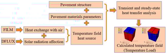 To calculate the temperature field, the user-defined subroutine FILM in the load module of ABAQUS was used to achieve the heat exchange of the pavement surface and the air, and the user-defined subroutine DFLUX in the interaction module was used to simulate the effect of solar radiation. The on-site measured air temperatures used to achieve the temperature and convective exchange are shown in Table 2, and the index used to simulate solar radiation is shown in Table 3. The initial temperature of the pavement structure was set to 0 °C, and the thermophysical parameters are shown in Table 4. The temperature field of the pavement structure was obtained using transient and steady-state heat transfer analysis. The action was repeated with the set solar radiation and air temperature data, and the final stable temperature field of the pavement structure was taken as the calculation result (5 cycles). The temperature field calculation logic is shown in Figure 2. According to a previous study and article [], the pavement bears higher tensile stress at 6:00 am. So, the calculated 6:00 am pavement structure temperature field was imported in ABAQUS as an unfavorable temperature condition.