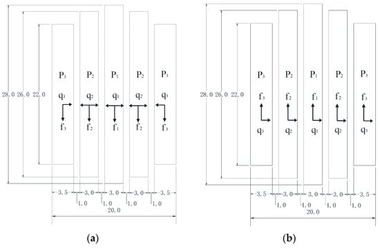 A 100 kN two-wheel axle load was applied as the vehicle load, and a single wheel was simplified as a three-dimensional non-uniform semi-sinusoidal load, as shown in Figure 3 [,,,]. Pi (i = 1, 2, 3) was the compressive stress on each wheel path that ran parallel to the normal direction of the pavement. qi (i = 1, 2, 3) was the transverse horizontal force perpendicular to the normal direction of the road, and fi (i=1, 2, 3) was the frictional force opposite to the driving direction on each wheel path.