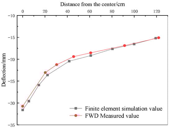 A finite element model with the same pavement structure as the highway was established, and a half-sine wave load with a peak value of 0.714 MPa, an action radius of 15 cm, and an action time of 30 ms was applied to simulate the FWD load. The deflection value at the same temperature as that measured by the physical engineering study was calculated. The comparison between the FWD measured deflection and the calculated deflection is shown in Figure 4.
