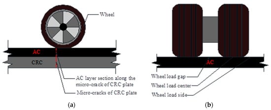 CRC + AC composite pavement is a kind of pavement structure that includes an AC layer on top of a continuously reinforced concrete (CRC) slab. This kind of pavement structure is one of the main structural forms of long-life pavement for heavy-duty traffic in China. It has a high bearing capacity, good driving comfort, and low maintenance and repair costs. CRC + AC composite pavement is a kind of rigid base asphalt pavement. The horizontal strain at the bottom of the asphalt layer is lower due to the modulus dependency of the pavement base [], which means that rigid base asphalt pavement has a longer fatigue life. However, owing to the thinness AC layer of CRC + AC, once cracks occur, they easily expand throughout the entire AC layer. Using physical engineering tracking observation, cracks in the AC layer were found to be major problems of CRC + AC composite pavement. As a type of durable pavement with a high initial investment cost, the cracking behavior of the AC layer, if not effectively controlled, increases maintenance costs, affects the service life of the asphalt layer, and even has an impact on the durability of CRC slabs, resulting in wasted investments.
