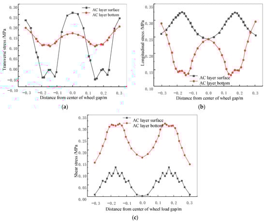 Stress of AC layer under normal driving conditions: (a) distribution of transverse stress; (b) distribution of longitudinal stress; (c) distribution of shear stress.