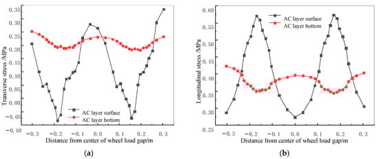 Figure 7 demonstrates that the stress distribution regularity of the AC layer under unfavorable driving conditions was almost the same as under normal driving conditions except for the longitudinal stress. According to Figure 7a, the maximum transverse tensile stress appeared on the right side of the wheel load, rather than near the wheel load gap. The maximum transverse tensile stress was 0.336 MPa, an increase of 29.7% compared to normal driving. It can be seen in Figure 7b that the distribution regularity of the longitudinal stress under unfavorable driving was almost the same as that under normal driving; the difference was in the wheel load gap, where the longitudinal stress of the AC layer bottom was greater than that of the AC layer surface. The maximum longitudinal tensile stress wheel load center of the AC layer was 0.573 MPa, which increased by 76.9% under unfavorable driving. As shown in Figure 7c, the maximum shear stress on both the AC layer surface and bottom appeared at the wheel load center, reaching 0.338 MPa and 0.379 MPa, respectively. At the same time, the shear stress values increased by 170.4% and 21.1%, respectively.