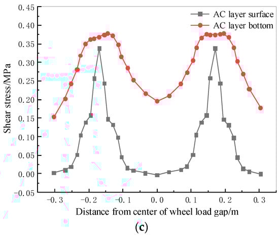 As shown in Figure 6a, both the wheel load side and the wheel load gap suffered greater transverse tensile stress on the surface and bottom of the AC layer under the thermal–mechanical coupling load. Compared to the surface and bottom of the AC layer, only the transverse tensile stress at the bottom of the AC layer at the wheel load center was higher across the entire wheel load range. The greatest transverse tensile stress values were 0.260 MPa at the wheel load gap, 0.138 MPa at the wheel load center, and 0.233 MPa at the wheel load side. It can be seen in Figure 6b that the longitudinal tensile stress was higher at the wheel load side of the AC layer bottom and the wheel load center of the AC layer surface, and the greatest longitudinal tensile stress values at each position were 0.297 MPa and 0.324 MPa. The longitudinal tensile stress almost achieved the same value of 0.243 MPa at the wheel load gap. In Figure 6c, it is clearly demonstrated that the shear stress at the AC layer surface was greater than that of the AC layer bottom on the entire wheel load. The shear stress was the highest at the wheel load center of both the AC layer surface and bottom, reaching 0.125 MPa and 0.313 MPa, respectively.