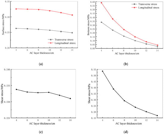 The CRC + AC composite pavement model and parameters were kept constant, except for the thickness of the AC layer. In order to investigate the influence of the AC layer thickness on mechanical performance, the thickness of the AC layer was changed from 4 cm to 14 cm. The maximum stress variations with the AC layer thickness are shown in Figure 8a–d.