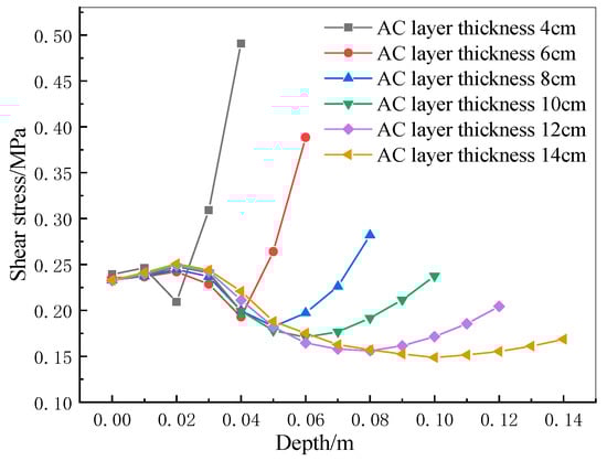 Due to the thinness of the AC layer and the large difference in the modulus between the AC and CRC layers, the asphalt layer was more likely to be penetrated by cracks. The thickness of the asphalt layer has a great influence on the rate of crack expansion [,]. Therefore, the thickness design of a rigid–flexible composite pavement asphalt layer is important. According to the literature [], asphalt layer cracking is more influenced by tensile and shear stresses. So, it was necessary to study the shear stress at different depths of the AC layer and its variation with different thicknesses. The results are shown in Figure 9.