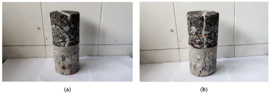 The rut depth of CRC + AC composite pavement is small, and the main disease is asphalt layer cracking, according to the above physical engineering’s tracking observation and core sampling. The samples are shown in Figure 10; (a) is the sample of “corresponding cracks”, and (b) is the sample of reflection cracks.