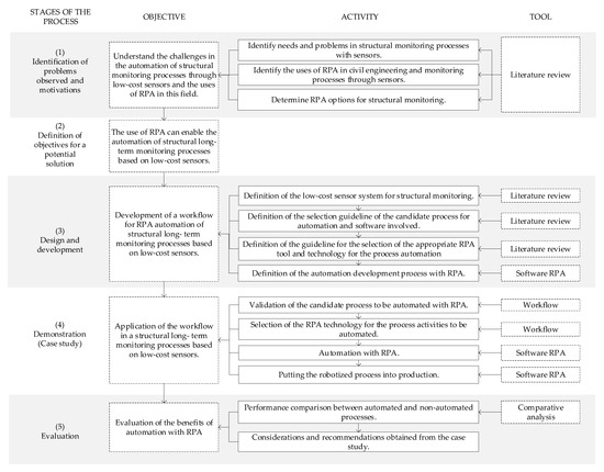 In the third stage, a workflow was proposed for the automation of the structural monitoring process with RPA—the DSRM artefact—through the following four activities: (1) defining the sensor system to be automated, (2) defining how to select the candidate automation process and identifying the software involved, (3) defining how to select the RPA tool and technology for automation, and (4) developing the automation development process with RPA.
