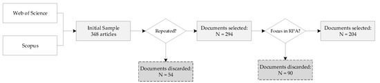 Automated processes with RPA are also known in the literature as bots or robots, and this automatization is produced with RPA software. Robots usually perform the following tasks: data transfer between applications through screen scraping, email query processing, and collation of payroll data from different sources, similar to what a human user would do [53,81]. To address an overview of RPA in the academic literature, Scopus and the Web of Science were surveyed to determine the productivity in this field. The key terms used were “robotic process automation” or “RPA”, with an initial sample of 348 articles obtained. After discarding duplicates and articles not focused on RPA or RPA applications, a sample of 204 papers was obtained. The selection process is summarised in Figure 2. This process was based on the reading of the abstracts of these papers. In specific cases, the sample paper was consulted when the abstract did not clarify the focus on RPA.