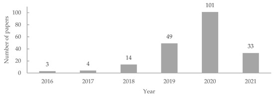 Yearly distribution of papers published with RPA applications.