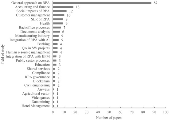 The analysis in Figure 4 shows that the works were focused on a general approach to an RPA field, and a holistic perspective of this technology was applied. Aspects highlighted in this group of works were contextualization in industry 4.0 [82] and trends in its application [83,84] The accounting and finance field included applications such as the automation of typical and repetitive accounting tasks [54], the auditing process [85,86], and case studies [50,87]. The third most developed field was the study of the social impacts of RPA. These papers mainly addressed aspects such as the change to human work with the task substitutions made with RPA [88], RPA–human coexistence [89], and psychological impacts on workers [87].