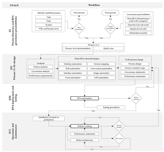 In the second stage, (II) Process To-Be design, the automated process, called the To-Be process [106], was designed based on the background obtained in the previous stage. This stage began with the analysis of the process documentation, governance, and performance requirements. This analysis was conducted to determine the feasibility of selecting the RPA sub-technology for automatization development. Finally, the process was reformulated, which could involve modifying, adding, or deleting existing tasks. The premise was to define an optimised sequence of activities to be automated, not necessarily the process in its initial pure state.