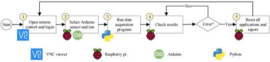 It should be noted that RPA is not presented in this work as a replacement for IoT technology. The ability of the used low-cost accelerometer to start data acquisition by itself and upload the acquired files to a cloud makes it an IoT-based device. Actually, in this work, RPA is programmed to perform repetitive tasks to enable the control of the data acquisition process, as well as to identify and solve malfunctioning errors while the IoT-based system is working.