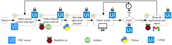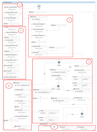 According to Table 3, in the work of Shah et al. [103], a Facial Emotion Recognition (FER) system was developed using Raspberry Pi 3 B+. RPA was used to automate the FER training process, in which a Python code linked to Raspberry Pi 3 B+ was executed with Uipath. Yamamoto et al. [104] implemented a remotely monitored building energy-saving system in which the applications that were involved were interfaced with RPA through remote control. The automation was based on image capture (Image Automation, according to Table 2) and linked to Excel, where the process rules were recorded.