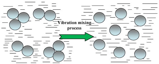 Due to the high-frequency vibration during the mixing process, the collisions, squeezing and rubbing movements of the components are strengthened, which destroys the initial hydrate film coating on the surface of cement particles and facilitates the change of the cement particles from agglomerated state to uniformly distributed state (Figure 2), resulting in better homogeneity of fresh mixture [51].
