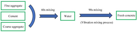 The new mixing approach divides the mixing process into two parts: pre-mixing process and key mixing process. The pre-mixing process can provide time for coarse, fine aggregates and cement to mix evenly. Water will be added in the key mixing process. At the same process, the mixer’s vibration mode is manually set in accordance with the plan. The mixing procedure is shown in Figure 3.