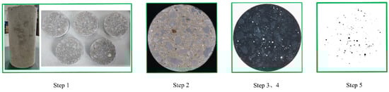 A novel methodology has been developed to quantify the air pores using digital image analysis. In this case, specimens with 150 mm diameter and 300 mm height were cut to obtain the circular cross-section at various heights. To obtain qualified samples, the first step (Step 1) is to cut the specimen along the direction perpendicular plane to the axis of the cylinder. After the 28 d curing age, five samples inside the specimens will be obtained from the top, middle and bottom of each cylinder, as illustrated in Figure 4.