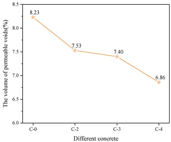 The specific surface area of air pores is positively correlated with the increase of vibration acceleration, as demonstrated in Table 2. The value of C-2 (8.57 mm−1) is higher than C-0 (7.94 mm−1), and the values of C-3 (9.26 mm−1) and C-4 (9.80 mm−1) are also significantly different from the reference group. A larger specific surface area means that the size of the pore is smaller. Therefore, this agrees with the findings in the results of pore size. The increase of the specific surface area with the vibration acceleration also indirectly proves that high-frequency vibration is favorable to the refining of pores during the mixing process, which ensures that air pores can remain stable in hardened concrete.