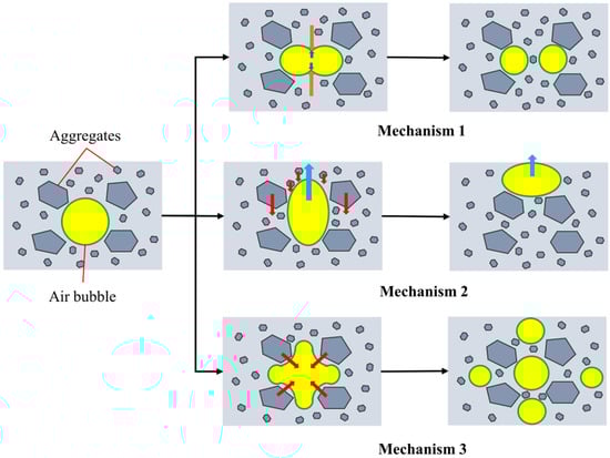 The average values of the equivalent diameters are illustrated in Table 2. It is noted that the average air pores size of C-0 is much greater than that of other mixtures. There was a considerable reduction in pore size as vibration acceleration increased. The average equivalent diameter of the C-2 and C-3 decreased by 27.7 μm and 51.4 μm compared to the reference group. C-4 has the smallest average size (327.9 μm), which is 85.5 μm smaller than C-0. These findings indicate that pores with smaller diameter remain in the hardened concrete using the vibration mixing process, and the size of air pores further decreases with the variation of vibration acceleration. It is well known that the air pores in hardened concrete are the continuation of the bubbles entrapped during the mixing process, which is a dynamic process. Therefore, the reduction in pore size using the vibration mixing process is attributed not only to the ability of the mixing blades to directly refine the entrapped air bubbles, but is also related to the subsequent changes of the bubbles already encapsulated in the mortar [54]. Firstly, the bigger bubbles are unstable throughout the mixing process and tend to escape from the interior of the mixture. The locally aggregated air bubbles will also escape due to combining into huge bubbles during the mixing process. Using the vibration mixing process, high-frequency vibration can reduce the “internal friction” of constituents and improve the fluidity of the fresh mixture. As a result, it is beneficial for the sand and aggregates in the mixture to sink, thereby accelerating the escape of unstable bubbles (mechanism 2 in Figure 8). This might be one cause for the pore size decrease. Furthermore, most of the air bubbles entrapped during mixing are likely to remain in the concrete. Due to the balance of their own surface tension and external force, these bubbles will keep a certain shape in the concrete. When using the vibration mixing process, the vibrational energy is transferred to the bubbles, resulting in a fluctuating inertial force on the bubbles’ surface. When the inertial force exceeds the surface tension of the bubble, the bubble will break and split into several smaller bubbles (mechanism 1 in Figure 8). This effect may explain why the bubble size reduces, as well as why the number of bubbles inside concrete using the vibration mixing process increases. Furthermore, not all big, unstable air bubbles can escape the concrete during the mixing and hardening process. Bubbles may encounter or be surrounded by aggregates in the path of the overflow, preventing their movement. Internal defects are eventually formed due to its retention around the aggregates, as seen in Figure 7. However, during the vibration mixing process, the vibrational energy can be transferred to the mixture, including the aggregates, via the mixing shaft, the mixing arm and the mixing blade. The high-frequency vibration can make the aggregates resonate, and then the aggregates will act as a small vibration source to release energy to the surrounding bubbles. When the aggregates exert more force on the bubbles than the surface tension, the bubbles will distort, burst and split into several little bubbles. As a result, the number of tiny air bubbles in the concrete will grow even more (mechanism 3 in Figure 8), resulting in a large reduction in the average pore size.