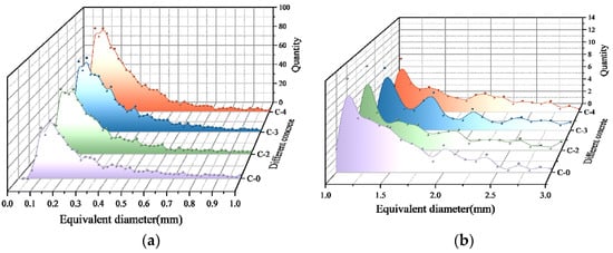The porosity, equivalent diameter or quantity are incapable of representing the pore structures in concrete, since they are only a global statistical factor. Pore size distribution, also known as pore gradation, refers to the number or proportion of pores of different sizes in a concrete pore system. It can directly reflect the variation of the pore system during different mixing processes. The results of pore size distribution are shown in Figure 9. The pore size distribution is separated into two parts: micrometer and millimeter, because the pore size ranges from micrometers to several millimeters. The size distribution of pores with an equivalent diameter between 50 μm and 1 mm is shown Figure 9a, while the size distribution of pores with an equivalent diameter greater than 1 mm is shown in Figure 9b. Figure 9a shows that, regardless of using the vibration or non-vibration mixing process, the pore structure for each concrete has a similar distribution with the variation of size, presenting an approximate lognormal distribution. This result is consistent with previous research [55,56]. All pore gradation curves have a major peak, which is mostly made up of pores with a diameter between 50 μm and 500 μm. Within this range, it can be found that the number of different pores in concrete using the vibration mixing process increases significantly. Especially in C-4, compared with the reference concrete, the number of pores in different diameter ranges (50–100 μm, 100–200 μm, 200–300 μm, 300–400 μm and 400–500 μm) relatively increased by 99.7%, 73.1%, 94.4%, 93.0% and 51.4%, respectively. In addition, most of the pores (80%) in C-2, C-3 and C-4 are in the range of 50–500 μm, 50–500 μm and 50–420 μm, respectively, whereas the range for C-0 is 50–600 μm. It can be seen that the majority of the pores in the concrete using the vibration mixing process are smaller in size. The mechanisms 1 and 3 of bubble change during the vibration mixing process in Figure 8 are responsible for these outcomes. Considering the diameter range of 500–1000 μm, there is no significant change in the number of different pores. However, as the total number of pores continues to increase from C-0 to C-4, the proportion of these pores decreases accordingly.