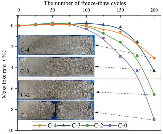 Figure 10 shows the variation in the mass loss rate of all concrete studied. It is evident that the mass loss rate decreased slightly with the increasing number of freeze-thaw cycles, especially starting from 100 cycles. After 200 cycles, C-0 and C-2 have failed with a mass loss rate of 8.96% and 6.55%, respectively. The pictures of the specimen also show that C-0 has completely fractured, while the aggregate of C-2 is completely exposed, and obvious cracks appear. In contrast, the mass loss rate for both C-3 and C-4 was less than 5%. As can also be seen from the corresponding photographs, there is only a little surface spalling of specimens and no obvious cracks or damage. The difference in the weight of the concrete after freeze-thaw cycling was caused by changes in the air pore system. The pore size distribution curves reveal that the number of different pores in concrete using the vibration mixing process increases significantly, especially pores with a diameter between 50 μm and 500 μm. These pores do a good job of releasing the osmotic pressure created by the freezing of the capillary solution during the freezing process. Furthermore, the water pressure caused by the freezing of water in the large pores is also reduced at the source as the number of macropores decreases.