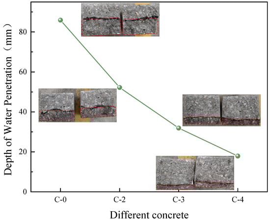 The result of the depth of water penetration is depicted in Figure 11. It can be seen that the depth of water penetration decreases with the increase of vibration acceleration. This is consistent with the finding of permeable voids. The values of C-2, C-3 and C-4 are reduced by 3.4 cm, 5.4 cm and 6.8 cm compared to C-0, respectively. This indicates that, owing to the vibration mixing process, the majority of the pores are closed and evenly dispersed inside the concrete, and are not interconnected with capillary pores. Therefore, the existence of these pores will not only have no detrimental influence on the microstructure and ITZ of concrete, but will also have a beneficial impact on its impermeability and durability.
