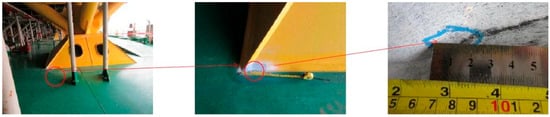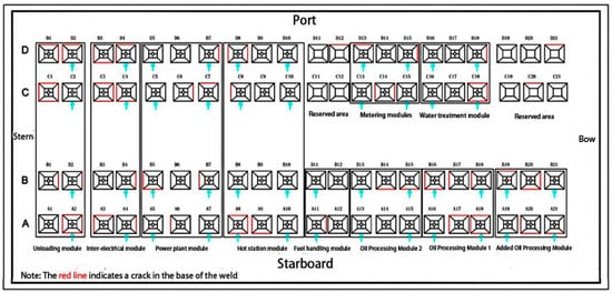 When FPSOs are subjected to wave action, the main load is created by the vertical shear force, torsional moment, and vertical bending moment. The wave causes buoyancy to change along the length of the ship, resulting in a total longitudinal moment, in which case, there will be mid-arch and mid-sag bends along the length of the ship. When the wavelength is equal to or close to the length, the total longitudinal moment of the wave is most significant, and the total longitudinal strength of the ship hull of FPSO is determined by the sagging state. According to the statistics on marine accidents in ship and ocean engineering, structural fatigue damage is the main cause of marine accidents. Seventy percent of the damage to large ships with captains over 200 m is fatigue damage. With fatigue damage to the hull structure, the focus is on the mutation area and stress concentration of the connection part of the component, namely, the fatigue of the connection node and high-stress area of the structure. FPSO is subjected to alternating stresses of the wave load for its whole life. In cases of strong wind and waves, cracks have been produced at the weld joint between the upper module support pier and the main deck. In the case of arch bends, the deck may be torn, resulting in an oil tank leakage accident. Figure 1 shows a crack distribution diagram for the upper module support pier.