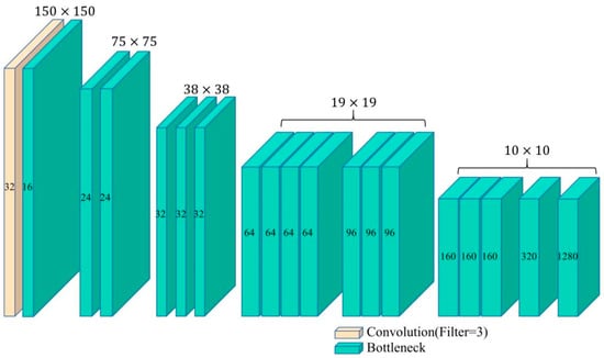 The main ideas of MobileNetv2 are deeply separable convolution, a linear bottleneck layer, and inverted residual []. Deeply separable convolution can greatly reduce the parameters of the model. Feature extraction and combination of the ordinary convolution layer are completed and outputted in one, while deeply separable convolution first uses a 3 × 3 convolution kernel with a thickness of 1, then uses a 1 × 1 convolution kernel (pointwise convolution) to adjust the numbers of channels, to separate feature extraction from feature combination. An inverse residual structure is the projection convolution of modules connected with residuals to raise the dimension, followed by depthwise convolution, and finally, using projection convolution to reduce the dimension. In MobileNetv1, the parameters of the depth convolution kernel are mostly 0, which means that its convolution kernel does not play a role in feature extraction. Due to the greater numbers of input and output channels in depthwise convolution, more information can be extracted. Figure 3 shows a diagram of MobileNetv2; as can be seen, feature maps of different scales can be outputted from MobileNetv2.