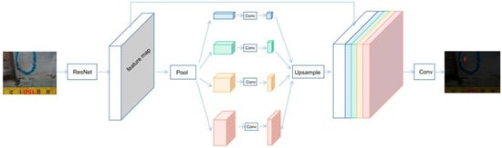 The PSPNet model is based on the FCN model and adopts a residual network to extract features. This model puts forward a Pyramid Scene Parsing module, which has been greatly improved for image segmentation. The network used in this paper is a modified feature-extraction network based on the PSPNet model. The original ResNet was composed of conv1_x, conv2_x, conv3_x, conv4_x, and conv5_x, among which conv1_1, conv2_1, conv3_1, conv4_1, and conv5_1 were downsampled once, respectively, giving a total of five instances of downsampling. The output feature map is 1/32 of the input size. In PSPNet, the ResNet module applies a dilated convolution, where conv1_x, conv2_x, and conv3_x remain unchanged. The stride of the first 1 × 1 convolution in conv4_1 is changed from 2 to 1, and the 3 × 3 convolution in conv4_x adopts dilated convolution with sampling rates of 2. The stride of the first 1 × 1 convolution in conv5_1 is changed from 2 to 1, and the 3 × 3 convolution in conv5_x adopted an expansion convolution with a sampling rate of 4. In this way, the downsampling times of the ResNet module when applying the expansion convolution are reduced by two to three times, and the output characteristic graph is one-eighth the input size; at the same time, the sensibility field of the feature map is enlarged by expanding the convolution.