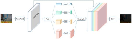 The important module in PSPNet is the Pyramid Scene Parsing module. The pyramid pooling module combines four features with different scales: 1 × 1, 2 × 2, 3 × 3, and 6 × 6. Features of different depths are pooled at different scales according to the input, and the feature dimension is reduced to one-quarter of the original through the 1 × 1 convolution layer. Finally, these pyramid features are directly upsampled to the same size as the input features, then combined with the input features to obtain the final output features. The process of feature merging involves fusing the detail feature (shallow feature) and global feature (deep feature) of the target. Figure 5 shows a structure diagram of PSPNet. Figure 6 shows a PSPNet structure diagram with Mobile as the backbone. The difference compared to the original PSPNet is that MobileNetv2 is used as the backbone, and the feature maps at six different scales generated by MobileNetv2 are used as the input.