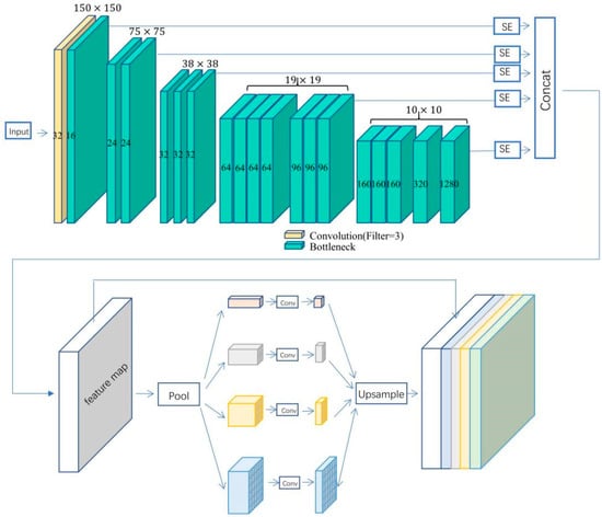 In this paper, on the premise of converting the PSPNet backbone network into MobileNetv2, six feature maps of different scales are extracted, which can aggregate the information of different feature maps and ensure that the network can extract richer semantic information. Since the original network undergoes various convolution and compression operations, the original feature information is lost, and so this method is beneficial for the model to extract fracture texture features and edge information. The five different feature maps were first passed through the attention mechanism network SENet to increase the weight of important information; accordingly, the weight of unimportant information was suppressed before entering the Pyramid Scene Parsing module. Figure 8 shows the architecture of the proposed model.