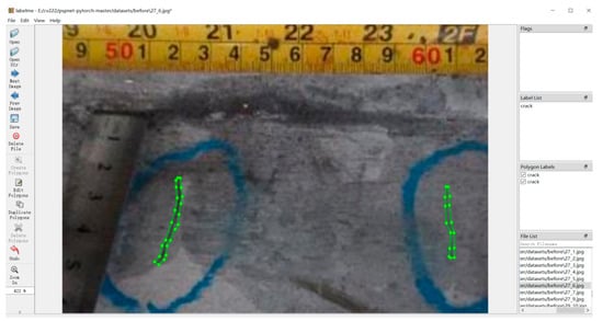 Labelme is an open-source annotation tool mainly for semantic segmentation class datasets. Labelme can annotate image data in various forms. Labelme stores annotation information in JSON files. In this work, we used the software to create a semantic segmentation class annotation of the FPSO dataset. The crack data annotation is shown in Figure 10.