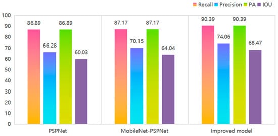 MobileNetv2 as the backbone showed an excellent performance, where a basic attention mechanism was introduced to enhance the performance of the model. This is because the background of the dataset in this paper was similar to the target object, and it was easy to recognize tiny cracks in the background during semantic segmentation. After the attention mechanism was introduced before feature extraction, the ability to identify cracks and extract contextual information was enhanced, as this is effective at recognizing tiny target objects. Table 3 and Figure 12 show the four performance indicators—recall, precision, PA, and IoU—for assessment of the background and cracks with different models. It can be seen that the crack-detection performance of the improved model was improved by 3.5%, 7.78%, 3.5%, and 8.44%, respectively, compared to PSPNet, and 3.22%, 3.91%, 3.22%, and 4.43% versus Mobilev2-PSPNet.