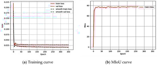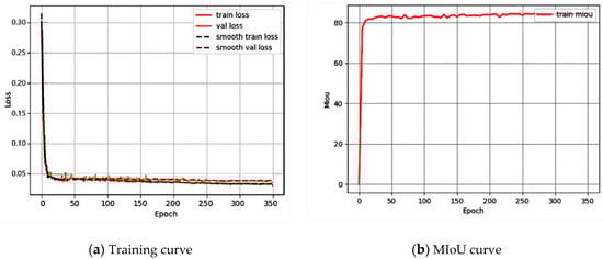 In Figure 13, Figure 14 and Figure 15, (a) represents the loss curve of the PSPNet model, and (b) represents its MioU curve. As can be seen from the training curve, the loss gradually converges to a stable value, while MioU gradually rises to a stable state. This demonstrates that the above three models are of practical significance. Figure 16 shows the results for crack identification by different means of semantic segmentation.