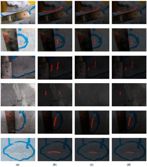 Results of crack identification by different semantic segmentation: (a) original image; (b) PSPNet; (c) MobileNetv2-PSPNet; (d) improved model.