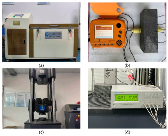 The test instruments: (a) freeze-thaw testing chamber; (b) ultrasonic detector; (c) MTS pressure testing machine; (d) LCR digital bridge.