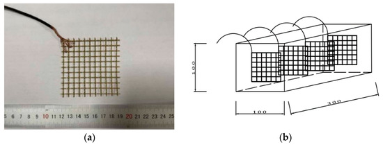 By referring to the standard for test methods of concrete physical and mechanical properties (GB/T 50081-2019) [24], 100 mm × 100 mm × 100 mm cube specimens were prepared, which were tested for their mechanical properties under the sulfate freeze-thaw cycle. For the pressure-sensitive tests under sulfate-freeze-thaw cycle conditions, a 70 mm × 70 mm copper mesh was used as the electrode. When preparing a 100 mm × 100 mm × 300 mm prismatic specimen, four electrodes were pre-buried inside the specimen. The embedding distance between the two adjacent electrodes was 60 mm. The size of the sample is shown in Figure 3.