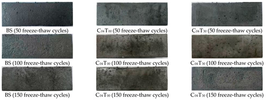 According to the test results, the specimen prepared by the mix ratio of BS (benchmark specimen), C04T00 and C04T30 groups has a typical apparent damage pattern, so the epidermal damage analysis is carried out. Figure 4 shows the apparent morphology of the BS, C04T00 and C04T30 specimens after 50, 100 and 150 freeze-thaw cycles in 8% sodium sulfate solution. From the longitudinal comparison, it can be observed that with the increase in the number of freeze-thaw cycles, the apparent morphology of each group of specimens continues to deteriorate, the middle and corners of the specimens are gradually missing, and the surface holes and cracks gradually increase. The apparent damage of the C04T00 specimen was relatively less affected by the number of freeze-thaw cycles. After 100 freeze-thaw cycles, the color of the specimen turned yellow and the local color became darker. After 150 freeze-thaw cycles, salt particles were precipitated on the surface of the specimen. It can be observed from the lateral comparison that after 50 freeze-thaw cycles, the surface of the BS specimen becomes loose and a few holes appear, while the apparent damage of the C04T00 and C04T30 specimens is not obvious. After 100 freeze-thaw cycles, the apparent deterioration of the BS specimen was obvious. The C04T00 and C04T30 specimens still maintain a relatively complete form, a small number of holes appear and the color of the specimen began to turn yellow. After 150 freeze-thaw cycles, the BS specimen was loose in texture, with obvious overall deformation and transverse penetration cracks. The C04T00 specimen edges and corners appear to be missing, and the texture is relatively dense. The C04T30 specimen has obvious holes and obvious surface corrosion marks. By observing the apparent morphology of the specimen, it can be concluded that adding a certain proportion of carbon fiber and iron tailings can effectively inhibit the development of cracks and maintain the integrity of the apparent morphology of the specimen. However, the specimens mixed with iron tailings and carbon fiber at the same time showed obvious damage after 150 freeze-thaw cycles, compared with the specimens with single carbon fiber.