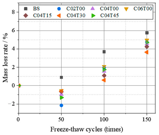 where is the average mass loss rate of a set of concrete specimens after N freeze-thaw cycles (%). The prismatic specimens of each group with a mix ratio were weighed after 50, 100 and 150 freeze-thaw cycles in 8% sodium sulfate solution, and the average mass loss rate of each group of specimens was calculated, as shown in Figure 5. The analysis shows that after 50 freeze-thaw cycles, the mass loss rate of the BS specimen is 0.9%, while the mass loss rate of the specimens mixed with carbon fiber and iron tailings is negative. On the one hand, the salt solution penetrated into the interior of the specimen and formed crystalline expansion products, which increased the quality. On the other hand, the specimens mixed with carbon fiber and iron tailings did not produce obvious external damage at the beginning of the freeze-thaw cycle, so the quality increased after freeze-thawing. With the increase in the number of freeze-thaw cycles, the mass loss rate of specimens mixed with carbon fiber and iron tailings gradually turns from negative to positive. This is because the salt solution freezes inside the specimen to generate pressure, and at the same time, the expansion of salt crystals generates pressure, which causes the specimen to be destroyed under salt erosion, and the mass loss of the specimen increases gradually. After 100–150 freeze-thaw cycles, the mass loss rates of all specimens were positive. After 150 freeze-thaw cycles, the mass loss rate of BS specimens reached 5.75%, which was significantly greater than that of the other specimens. After the addition of carbon fiber and iron tailings, the compactness of the cement-based material can be improved, the salt solution penetrates into the inside of the specimen by a relatively small amount, the expansion pressure generated by freeze-thawing results in little damage to the interior of the specimen, and the quality loss rate of the specimen does not exceed 5%, of which the C04T30 specimen quality loss rate is the smallest, only 3.65%. With the increase in carbon fiber and iron tailing content, the mass loss rates of C04T45 and C06T00 specimens were 4.7% and 4.95%, respectively. This is due to the insufficient hydration reaction caused by the agglomeration of carbon fiber and iron tailings in the interior of cement-based material, so the excessive incorporation of carbon fibers and iron tailings did not play a role in improving the durability of cement-based materials.