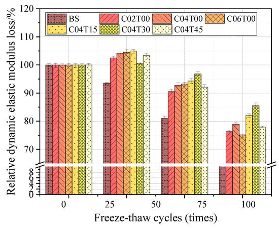 where is the average relative dynamic elastic modulus of a group of concrete specimens after N freeze-thaw cycles (%). Prismatic specimens were prepared according to the mixing ratio of each group, and were subjected to 50, 100, and 150 freeze-thaw cycles in 8% sodium sulfate solution, respectively. The NM-4B non-metallic ultrasonic testing analyzer was used to measure the transverse fundamental frequency, and the relative dynamic elastic modulus of each group of specimens was calculated as shown in Figure 6. The analysis shows that the relative modulus of the BS specimen decreases with the increase in the number of freeze-thaw cycles. After 50 freeze-thaw cycles, the relative dynamic elastic modulus decreased significantly faster, indicating that the damage degree of the BS specimen increased. When the freeze-thaw cycle occurred 150 times, the relative dynamic elastic modulus of the BS specimen was 0.63, which almost reached the state of failure. The relative dynamic elastic modulus of the specimens mixed with carbon fiber and iron tailings sand generally showed a trend of first increasing and then decreasing after the freeze-thaw cycles. When the freeze-thaw cycle occurred about 50 times, its relative dynamic elastic modulus reached its peak value, and when the freeze-thaw cycle occurred 150 times, its relative dynamic elastic modulus was higher than 0.75, and its durability was significantly better than that of the BS specimen. This is because the fine powder of iron tailings sand reacts with calcium ions and silicon ions in the cement slurry to form hydration products, such as C-S-H gel, which causes the interior of the specimen to be continuously filled with crystals. Therefore, the relative dynamic elastic modulus of cement-based composites has an upward trend in the early stage of freeze-thaw cycles. With the progress of the freeze-thaw cycle, the expansion stress generated by the crystals increases continuously, and cracks appear inside the specimen. At this time, the tensioning and compaction effect of the carbon fiber and iron tailings in the cement colloidal caused the relative dynamic elastic modulus of the carbon fiber and iron tailings sample to decrease, but was still significantly higher than the relative dynamic elastic modulus of the BS specimen [28]. When the carbon fiber dosage reaches 0.4% and the substitution rate of iron tailings reaches 30%, the relative dynamic elastic modulus of the C04T30 specimen measured in the entire freeze-thaw cycle test is always the highest, indicating that its frost resistance is optimal. At the same time, it also shows that continuing to increase the content of carbon fiber and iron tailings does not make the cement-based composite material achieve a better antifreeze effect, which also indirectly confirms the analysis results of the quality loss rate.