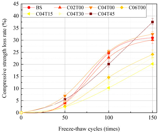 where —the loss rate of concrete compressive strength after N freeze-thaw cycles (%), —the measured value of compressive strength of a set of concrete specimens for comparison (MPa); —the measured value of compressive strength of a set of concrete specimens after N freeze-thaw cycles (MPa). The cube specimens with the mixing ratio of each group were tested with 50, 100, and 150 freeze-thaw cycles in 8% sodium sulfate solution, respectively. The MTS2000kN electro-hydraulic servo universal testing machine was used to measure the compressive strength of the specimens, and the compressive strength loss rate of each group of specimens was calculated, as shown in Figure 7. The analysis shows that the compressive strength of the BS specimen decreases with the increase in the number of freeze-thaw cycles. After 50 freeze-thaw cycles, the compressive strength loss rate further increased, indicating that the degree of deterioration of the specimen was more obvious. After 100 freeze-thaw cycles, the compressive strength loss rate gradually exceeded 25%, and the BS specimen changed from critical destruction to complete destruction. In contrast, due to the uneven stirring of carbon fiber or excessive incorporation of carbon fiber to cause agglomeration, and the entry of air bubbles to reduce the internal density of the specimen, the compressive strength loss rate of the specimens doped with carbon fiber alone in the early and middle periods of the freeze-thaw cycles is close to or greater than that of the BS specimens. After 150 freeze-thaw cycles, the carbon fiber exerted its crack resistance, so that the compressive strength loss rate of the single-doped carbon fiber specimens was smaller than that of the BS specimens. For the specimens that are mixed with carbon fiber and iron tailings at the same time, because iron tailings improve the compactness of cement-based composites, the internal pores become smaller so that the freeze resistance of the specimens can be improved. Therefore, even after 150 freeze-thaw cycles, the compressive strength loss rate of the double-doped carbon fiber and iron tailing specimens still does not exceed 25%.