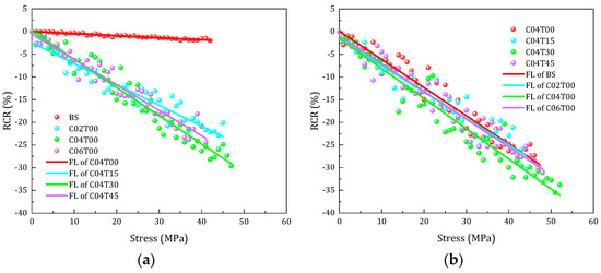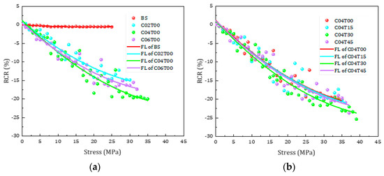 Stress–RCR fitting curves of cement-based composites under 150 freeze-thaw cycles. (a) Stress–RCR curves of BC, C02T00, C04T00, C06T00, (b) stress-RCR curves of C04T00, C04T15, C04T30, C04T45.