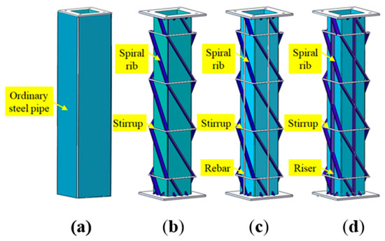 Cross-sectional form diagram. (a) Ordinary steel pipe; (b) Spirally ribbed steel pipe; (c) Rebar spirally ribbed steel pipe; (d) Vertical-plate spirally ribbed steel pipe.