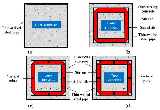 For thin-walled steel pipe concrete members, facing the problem of rapid degradation of the force performance, some scholars used the setting of the spiral hoop and ring hoop and other forms to improve the deformation capacity [12,13,14,15]. They found that the setting of the spiral hoop can improve the non-uniform restraint of the square steel pipe, delaying the onset of local buckling of the rectangular steel pipe, and the restraint is stronger than the vertical plate stiffening ribs. Wu et al. [16] studied the compressive performance of a composite thin-walled circular section steel pipe column concrete with hoop reinforcement and found that the hoop reinforcement significantly improved the load-carrying capacity and ductility of the column. The seismic energy dissipation capacity of the spiral stirrup column led scholars to conduct low-frequency cyclic reciprocating load tests [17,18,19]. The results show that the spiral stirrup can improve the deformation capacity and the flexural bearing capacity of the column. In order to further enhance the lateral restraint effect of steel tubes, many scholars conducted experimental studies on concrete-filled steel tubular members with tie rods and tie plates [20,21,22] and found that reducing the tie rod spacing and installing tie plates can improve the working performance of the columns and increase the bearing capacity and deformation capacity of the specimens. In addition, the setting of restraint rods can make the restraint effect of the steel pipe wall on the core concrete more uniform, change the local buckling deformation state of the steel pipe, and significantly improve the axial compressive bearing capacity and ductility of the square steel tube concrete column.