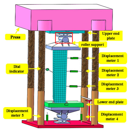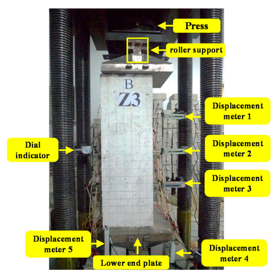 The test was conducted with five displacement gauges and a percentage meter along with the column height, which was arranged in the middle of the column, the upper and lower quarters of the column length, and the bottom position, respectively. The initial eccentricity of the specimen is 0.4, and the roller support is set at the bottom. The loading device is shown in Figure 3, and the test site is shown in Figure 4. The elastic phase is controlled by the load; when the specimen enters the elastic–plastic phase, it is controlled by displacement until the load is reduced to 80% of the ultimate load and the test is completed.