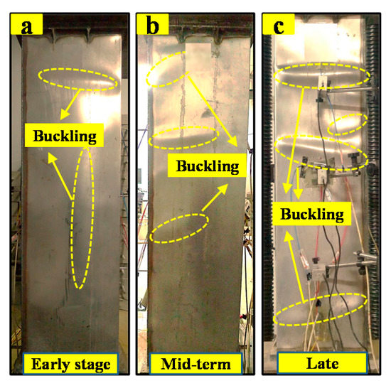 Specimen Z1 is an ordinary thin-walled square steel tube concrete column. There was little change at the beginning of loading, and when the bias load reached 850 kN, local buckling occurred at 200 mm from the top of the column (Figure 5a). When the load increased to about 1240 kN, local buckling occurred in the middle of side D of the specimen (Figure 5b). When the load reached 1775 kN, the deformation of the previously buckled tubes increased, and the specimen reached the ultimate load-carrying capacity. Thereafter, the load started to drop and reached 1600 kN when several corrugated zones indicative of local flexural deformation appeared on the compressed side of the specimen on the A-side (Figure 5c). The test was then stopped.