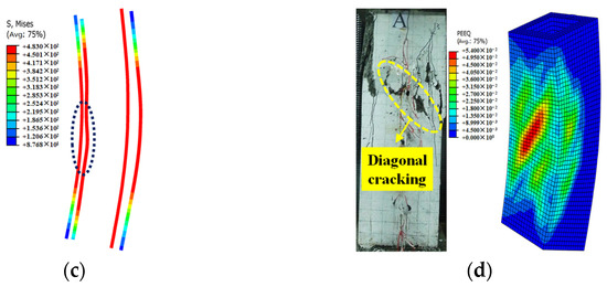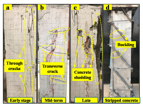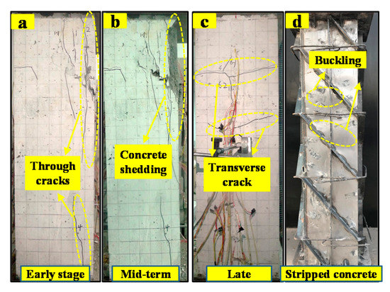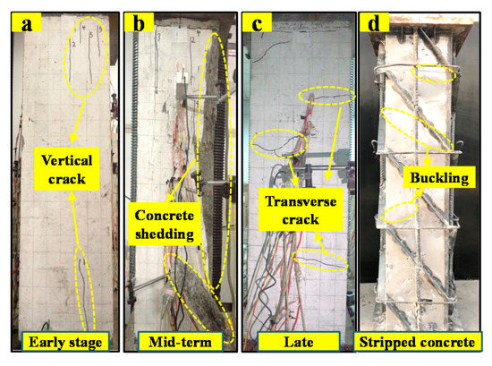 Specimen Z3 is a spiral rib-reinforced thin-walled concrete-filled steel tubular laminated column. The test procedure was as follows: When loaded to 970 kN, vertical cracks of approximately 30 mm in length appeared on the compressed side. At the same time, vertical cracks of approximately 15 mm in length were produced on the compressed side of faces B and D (Figure 7a). When the load was increased to 1420 kN, a vertical crack of about 30 mm was produced on the lower part of the compressed side (side B). When the ultimate load was approached, a transverse crack appeared on the tensile side at about 220 mm from the top of the column, and the concrete wrapped around the compressed area began to spall (Figure 7b). When the load reached the ultimate bearing capacity, the crack on the upper part of the tensile side extended from both sides to sides B and D, and a new transverse crack was produced in the middle of the specimen (Figure 7c). At the end of the test, after stripping the external concrete, it was found that the steel tube on the compressive surface had undergone a slight buckling, the spiral rib had undergone no obvious deformation, and the reinforcement was bent and deformed (Figure 7d). Compared to the Z2 specimen, the external concrete cracking was better controlled with the external reinforcement set in conjunction with the spiral ribs.